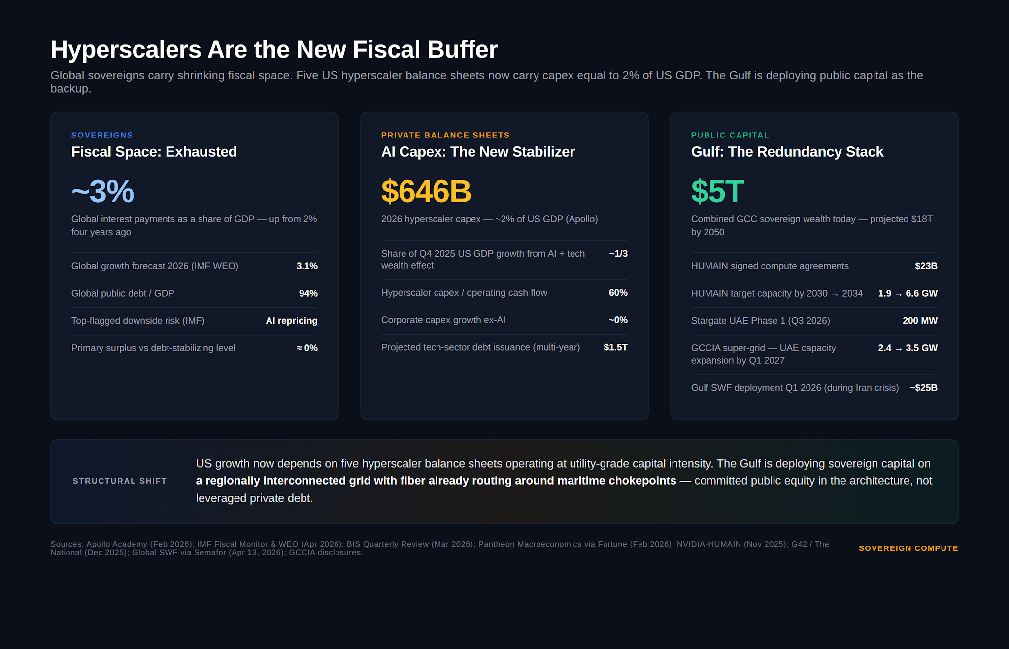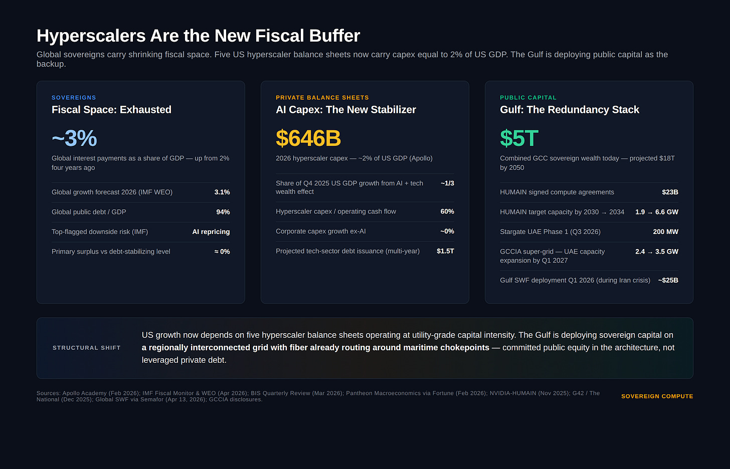 Five US hyperscaler balance sheets now carry capex equal to 2% of US GDP. Sovereigns carry the rest. In a multipolar system with thinner public budgets, the Gulf's public capital stack is building the redundancy needed.