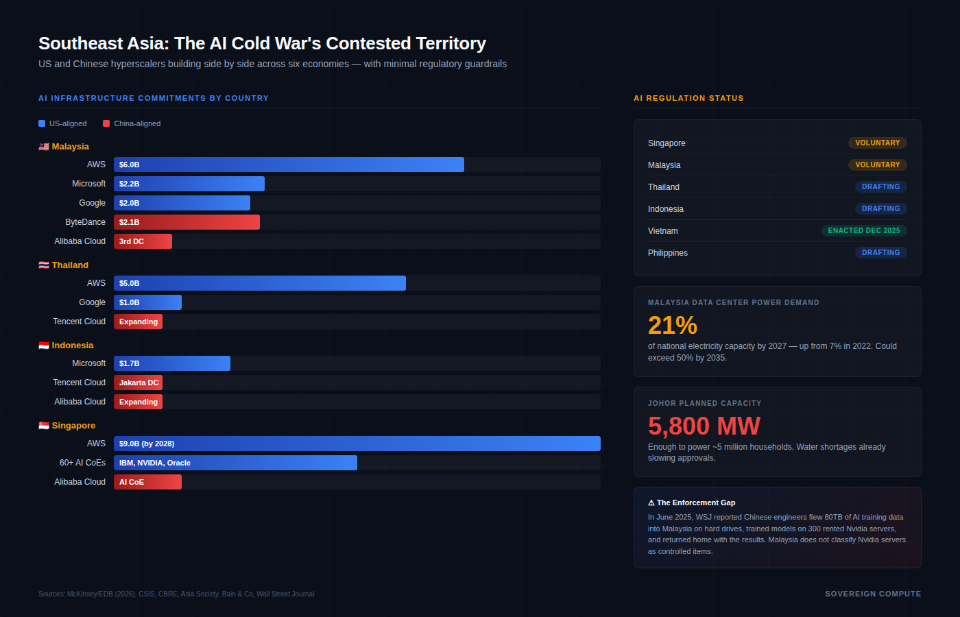 Sources: McKinsey/EDB “AI in Southeast Asia” (Feb 2026); Bain/Google/Temasek “e-Conomy SEA” (2025); CSIS “Cloud Computing in Southeast Asia and Digital Competition with China” (Oct 2024); CSIS “Beyond the Matrix: AI Governance Gaps in Southeast Asia” (2025); Wall Street Journal (Jun 2025); CNBC Johor data center investigation (Aug 2025); Asia Society Policy Institute (Jan 2026); CBRE Asia Pacific Data Centre Outlook (2026); ISEAS-Yusof Ishak Institute (Feb 2026); Crowell & Moring ASEAN Digital Ministers analysis (2026).