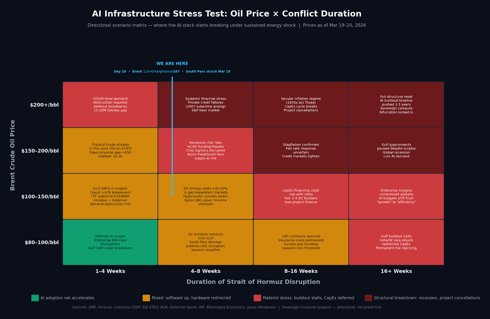 The stress-test matrix above maps where specific AI stack components begin to fracture, plotted against oil price and conflict duration. The thresholds are directional, anchored to observable data. Saudi Arabia’s fiscal breakeven sits at $78–94 per barrel depending on whether PIF spending is included (IMF, Bloomberg Economics), meaning Gulf sovereign wealth funds are currently generating windfall surpluses of $49–72 billion annualized. Goldman Sachs estimates European gas at €74/MWh would replicate 2022-level demand destruction. On March 18, TTF spiked to $24/MMBtu—approximately €75/MWh—touching Goldman’s crisis threshold intraday before settling lower, with Brent at $109. TTF has since traded in the €50–67/MWh range, trending toward the crisis line as South Pars damage compounds.