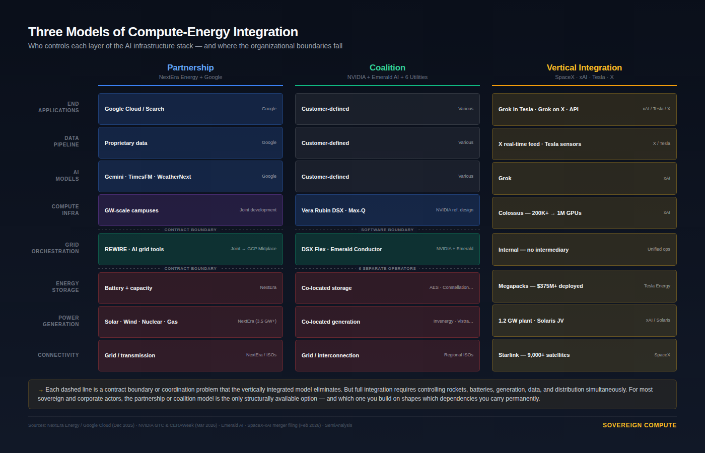 Build on the partnership model and you get speed, but you layer your hyperscaler’s AI deep into your energy operations. Build on the coalition model and you get vendor flexibility, but you depend on a reference architecture you don’t own. The fully integrated model eliminates those trade-offs—but it requires controlling rockets, batteries, generation, data, and distribution simultaneously, a portfolio that exists exactly once on earth.