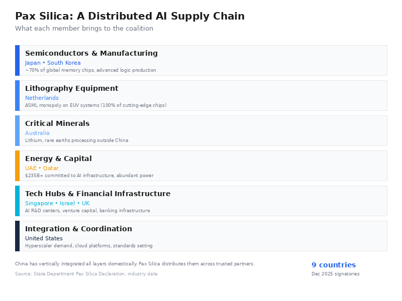 In December 2025, the U.S. State Department launched Pax Silica — a framework of nine countries (now expanded to eleven) committed to a coordinated AI supply chain spanning semiconductors, critical minerals, energy infrastructure, and compute capacity. The signatories: United States, Japan, South Korea, Australia, Israel, Singapore, the UK, the Netherlands, Qatar, Greece, and the UAE. India is potentially next.