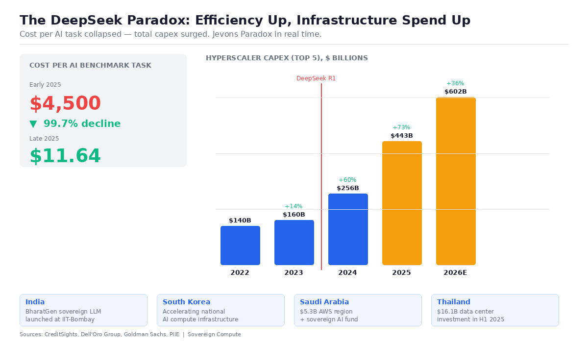 The shift traces back to an economics concept from 1865. When DeepSeek released its V3 and R1 models in late 2024 and early 2025, demonstrating that frontier-capable models could be built for a reported $5.6 million in GPU compute costs — a fraction of what Western labs assumed necessary, even after accounting for excluded R&D and infrastructure overhead — the immediate market reaction was panic: if AI is getting cheaper, who needs all this infrastructure?
